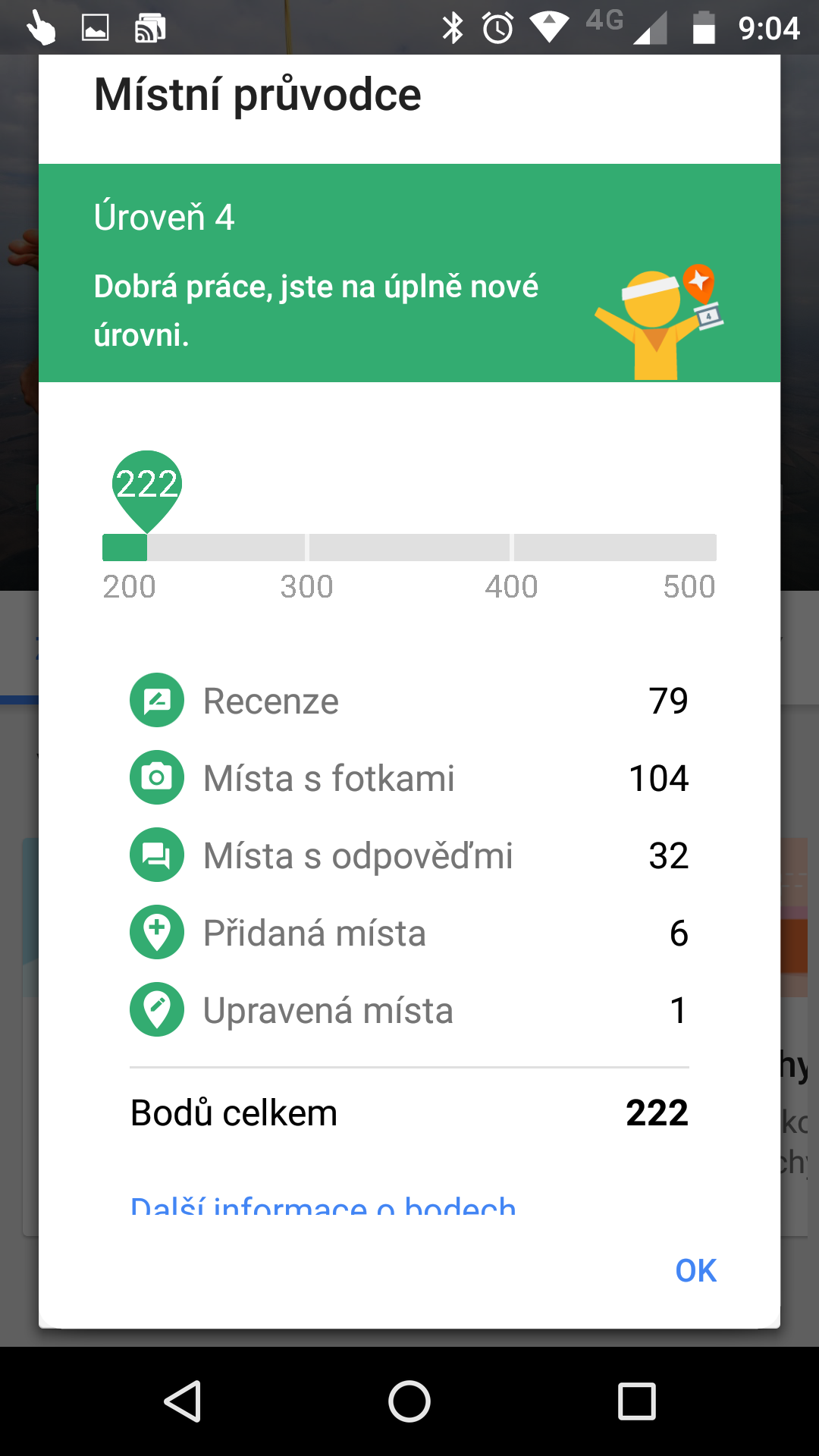 K ukončení 100GB bonusu zřejmě došlo kvůli tomu, že není vůbec těžké dosáhnout na 4. úroveň. V podstatě stačí naspat pár recenzí, ohodnotit podniky, odpovědět na otázky a hlavně poslat fotografie z konkrétních míst. Ostatně se podívejte na bodové ohodnocení aktivit:
