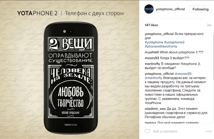 Podle dřívějších informací měl být po YotaPhone 2 představen levnější model YotaPhone 2C, ale nestalo se tak. Před koncem roku 2015 výrobce oznámil, že plánuje model YotaPhone 3, který vytvoří ve spolupráci s firmou ZTE. Model měl být představen v prvním kvartálu 2016, čili před rokem. Doposud se tomu tak nestalo. Před dvěma týdny se však na oficiálním instagramovém účtu společnosti YotaPhone objevil komentář s odpovědí na dotaz ohledně příchodu již rok očekávaného telefonu (viz výše). Odpověď zněla: