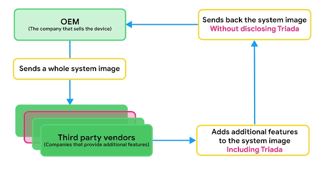 Google ve svém rozsáhlém článku nastínil, jak se malware Triada dostává do zařízení. V podstatě se tak stává u takových značek, které si nechají u jiné společnosti vyrobit hardware a následně do zařízení vloží svůj software. Ten zpravidla obohacují o dodatečné aplikace, kde se právě již ukrývá Triada. Zákazník tedy dostane již infikované zařízení.