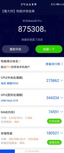 Celkové nejvyšší skóre má Snapdragon 875 hlavně díky extrémně výkonnému procesoru. Zařízení má však 12 GB RAM oproti 8 GB v Huawei Mate 40 Pro. Kirin 9000 však vítězí v grafickém výkonu a také rychlosti úložiště. Paměť RAM a úložiště jsou však poměrně proměnlivé komponenty, protože každý výrobce může použít jiné druhy pamětí, čímž se výsledky mohou změnit.