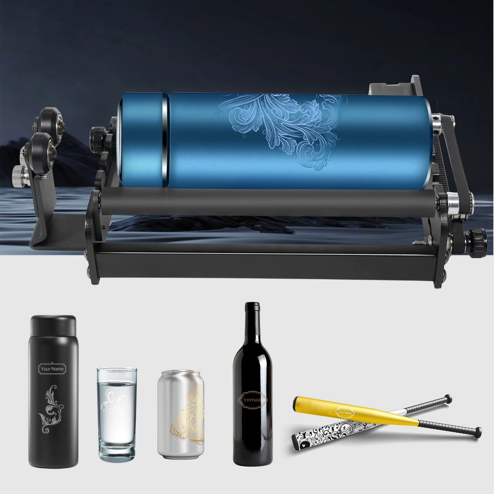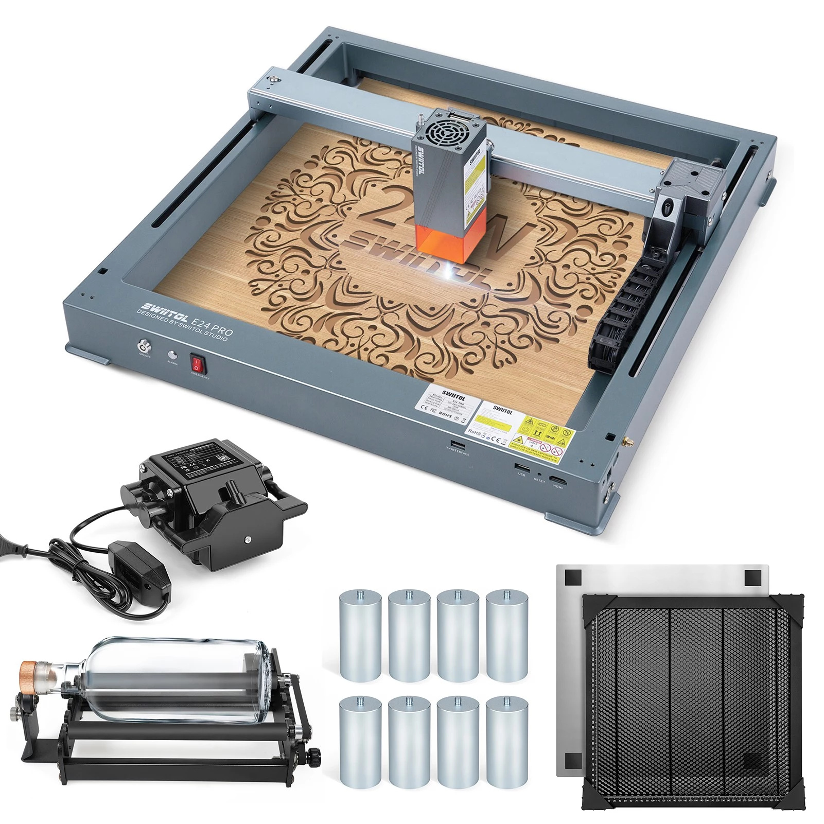 Získal si E24 Pro vaši pozornost? Pokud ano, tak na oplátku můžete něco získat i vy: zvýhodněnou sadu, která kromě této gravírovačky/řezačky obsahuje ještě speciální – a velmi praktické – příslušenství. Jedná se o speciální rotační modul, který je skvělý pro gravírování předmětů jako jsou lahve, plechovky, sklenice či další cylindrické předměty.