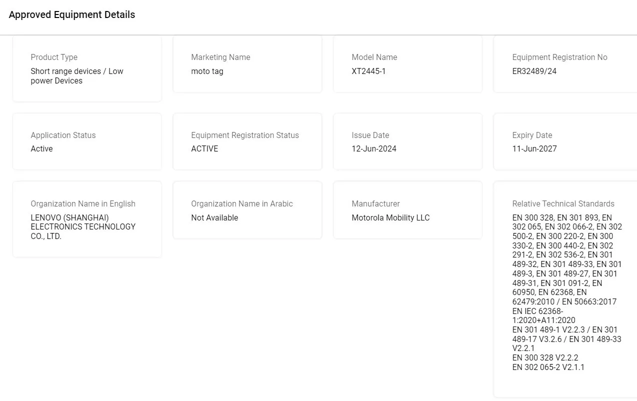 Díky certifikačnímu procesu SAE (Telecommunications and Digital Government Regulatory Authority, TDRA) se dozvídáme, že se novinka bude jmenovat Moto Tag a vyjde přímo pod společností Motorola, přičemž výrobcem je mateřská společnost Lenovo. Kódové označení je XT2445-1, ale následný název bude Moto Tag.
