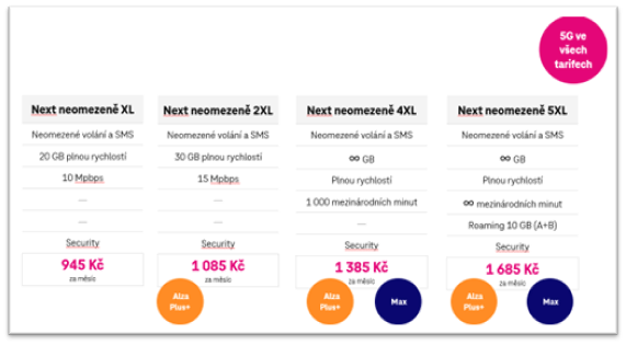 Další sada tarifů Next má přívlastek Neomezeně. Zde se již liší tarify rychlostí připojení, přičemž první dva mají FUP limit, respektive balíček dat, která můžete vyčerpat maximální rychlostí, pak je omezena na 10 nebo 15 Mbpx. Dva nejdražší pak nemají jakékoliv neomezení. Nejlevnější přijde na 945 Kč měsíčně a jen u dražších můžete získat bonusy zdarma v podobě služeb partnerů T-Mobile.