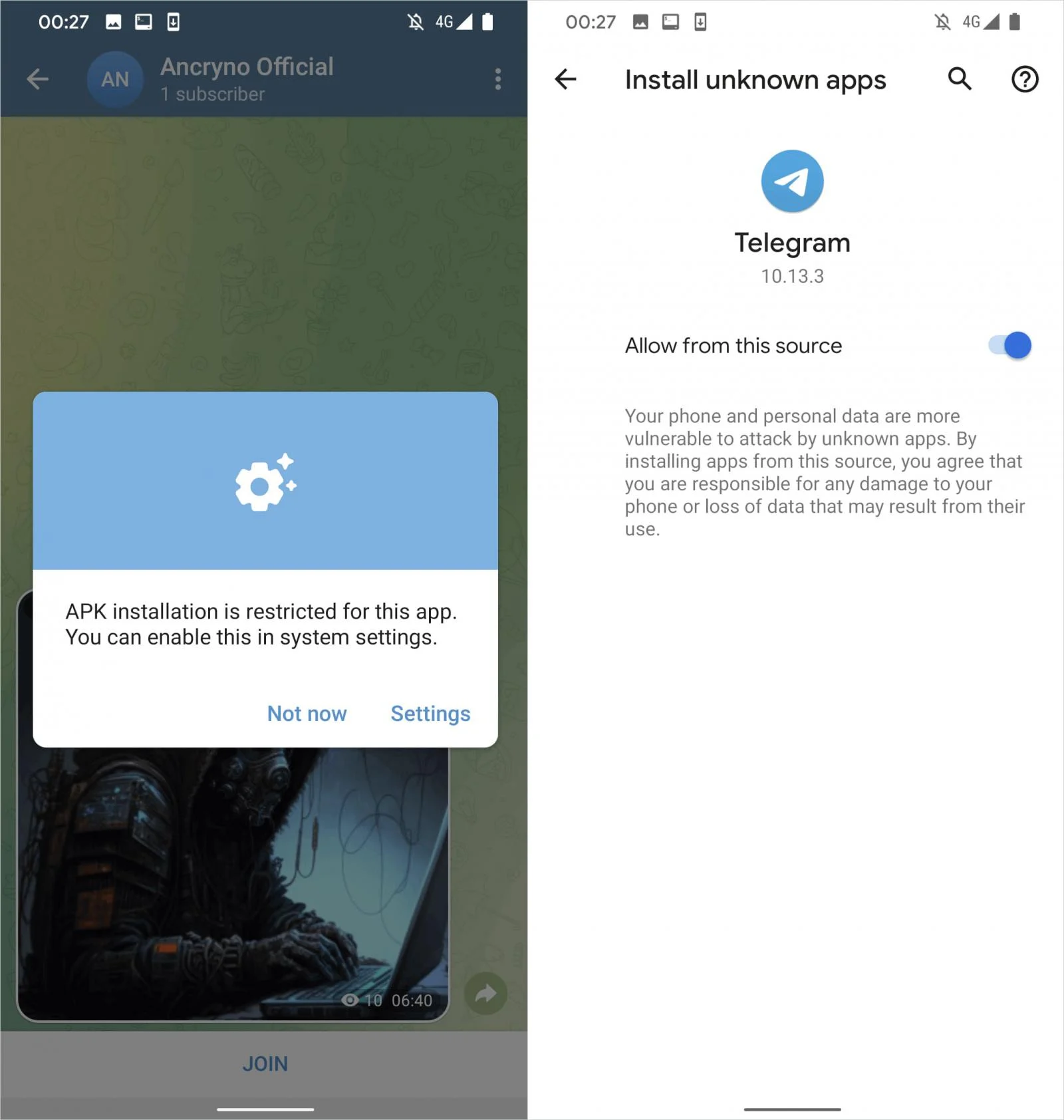 Vzhledem k tomu, že většina uživatelů má v Telegramu nastaveno, že se mají soubory automaticky stahovat, tak je vlastně škodlivé APK již v zařízení, ale zde ještě nehrozí nebezpečí. Po zobrazení varování, že je nutné použít jinou aplikaci ke spuštění, se zobrazí informace, že Telegram nemůže instalovat aplikace. Pokud toto uživatel povolí, v podstatě následně nainstaluje škodlivý malware.