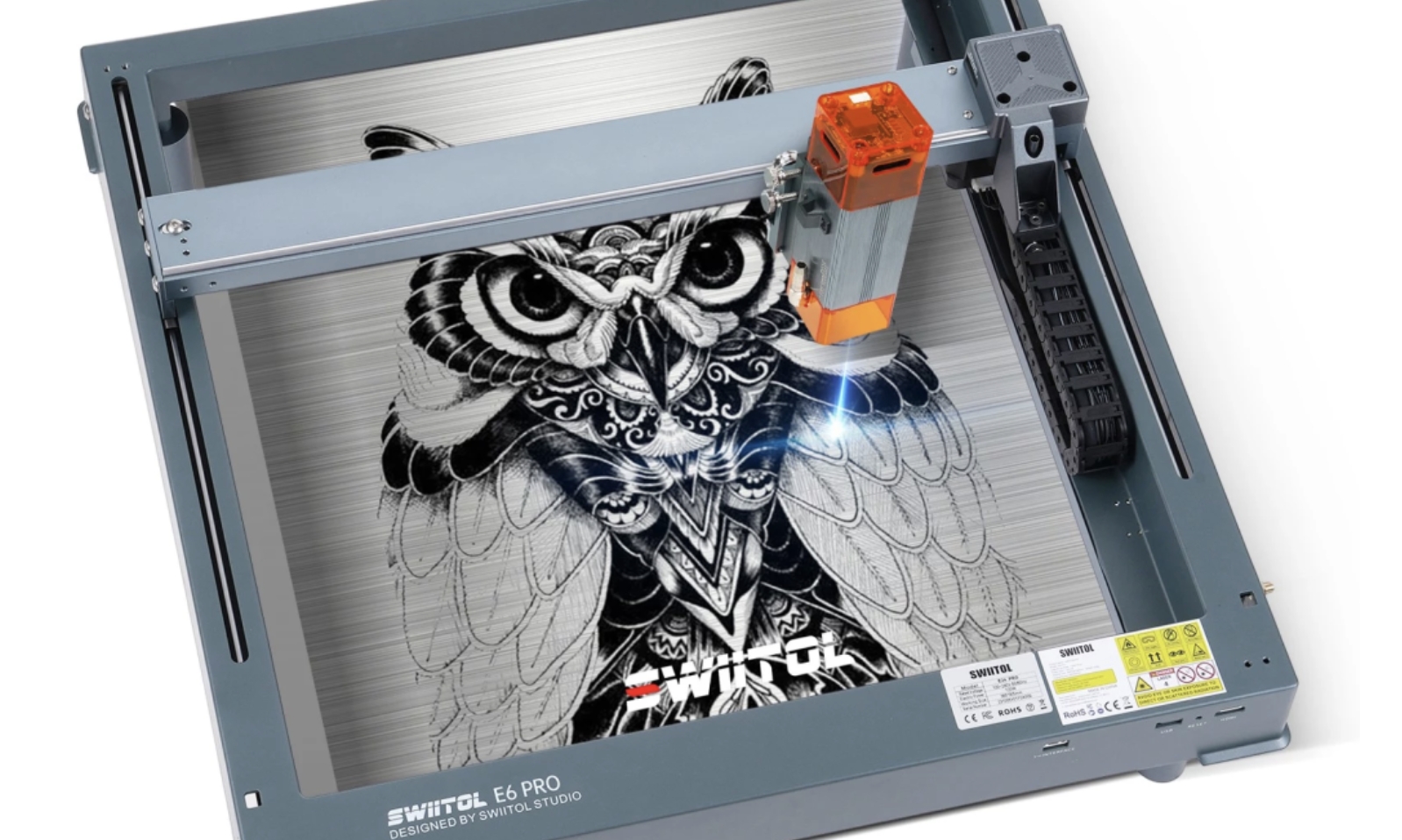 Díky integrované struktuře a kovové ose X se dvouosá vodicí lišta E6 Pro stará o minimalizaci chvění při vysoké rychlosti až 36000 mm/min. Pracovní plocha 365×305 mm a ultrajemná ohnisková plocha laseru 0,06×0,06 mm zajišťují precizní a rychlé gravírování.