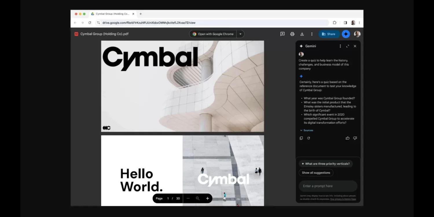 Boční panel, běžící na enginu Gemini 1.5 Pro, lze použít pro shrnutí „dlouhých, komplikovaných pdf dokumentů“, kdy můžete pokládat otázky ohledně dokumentu. Dále je také možné:
