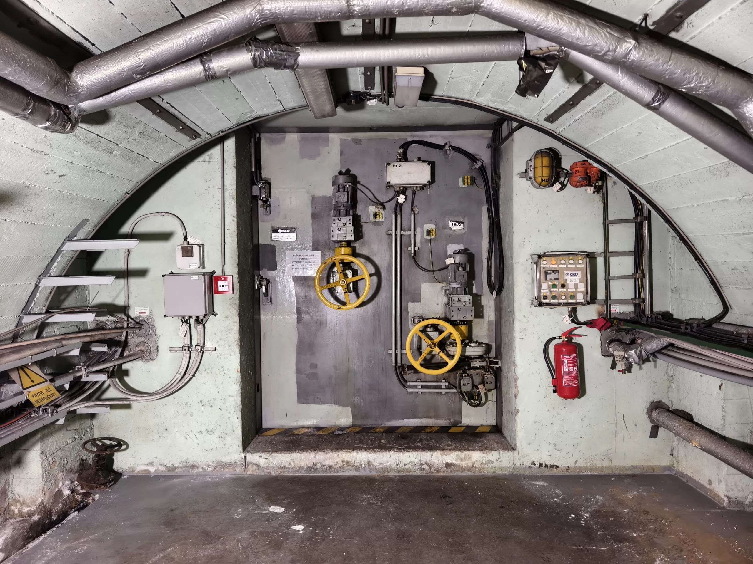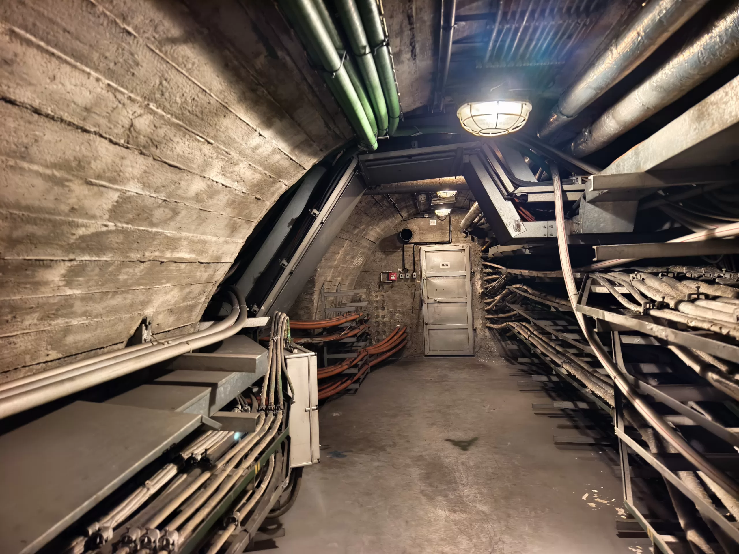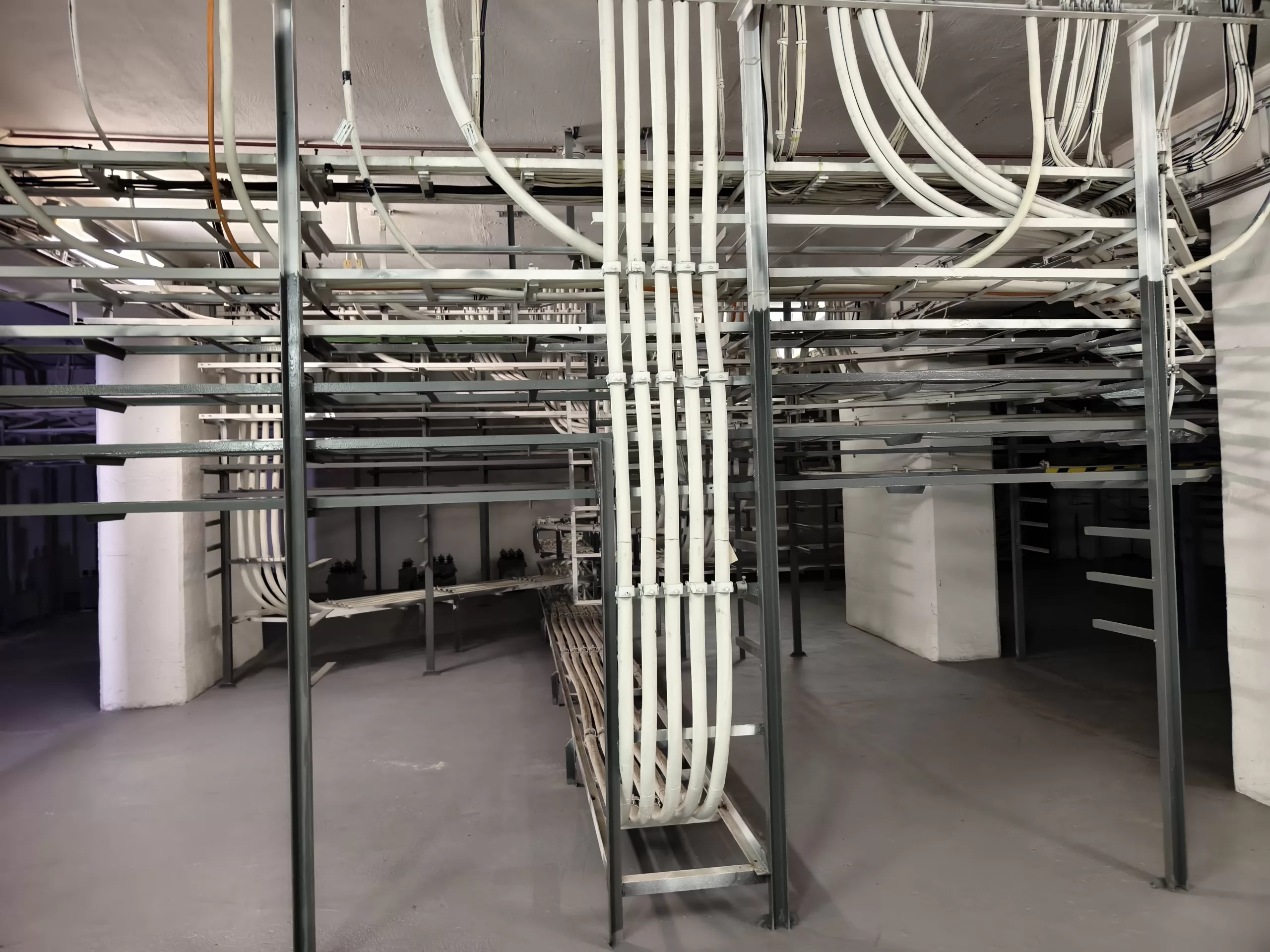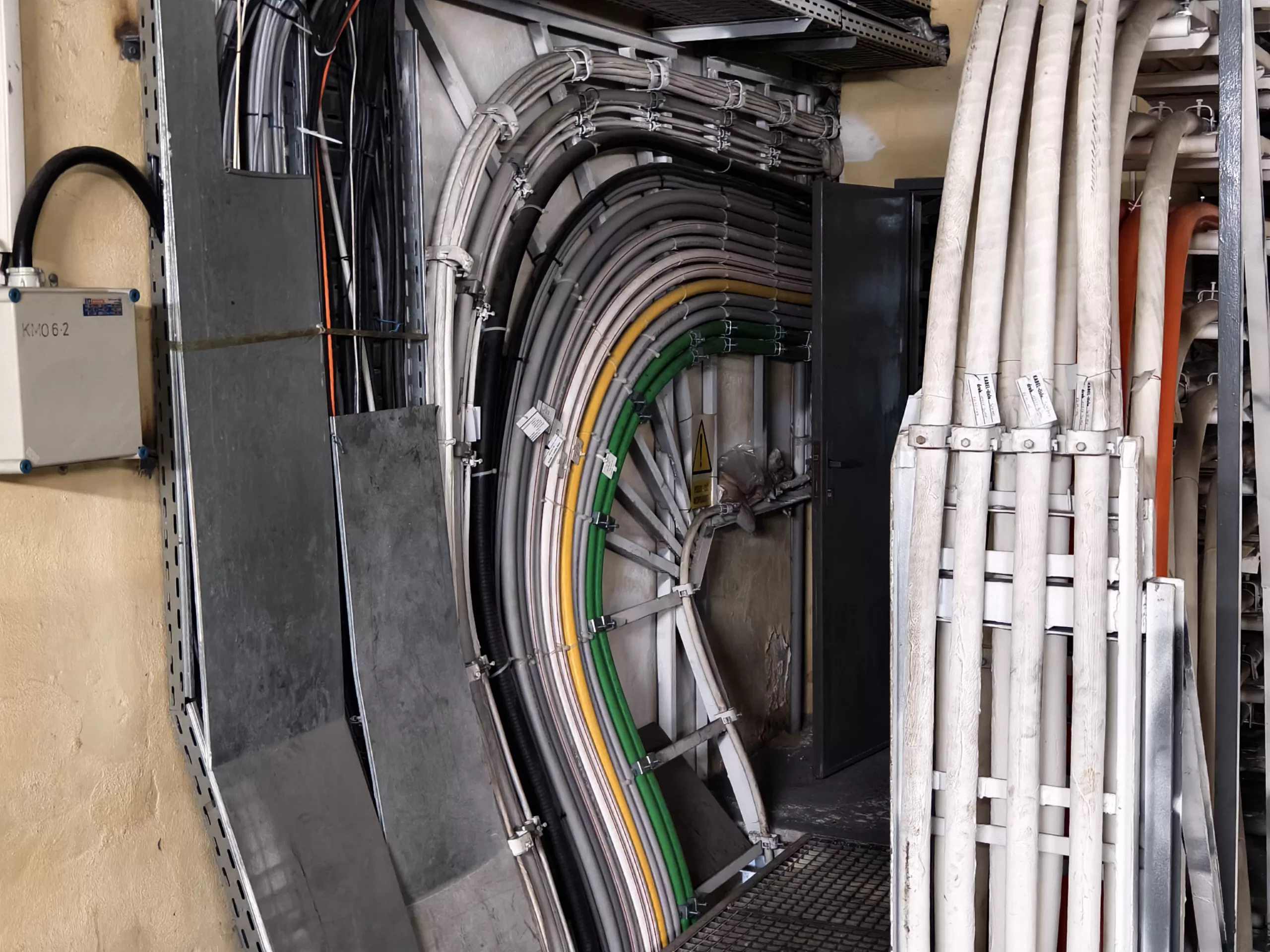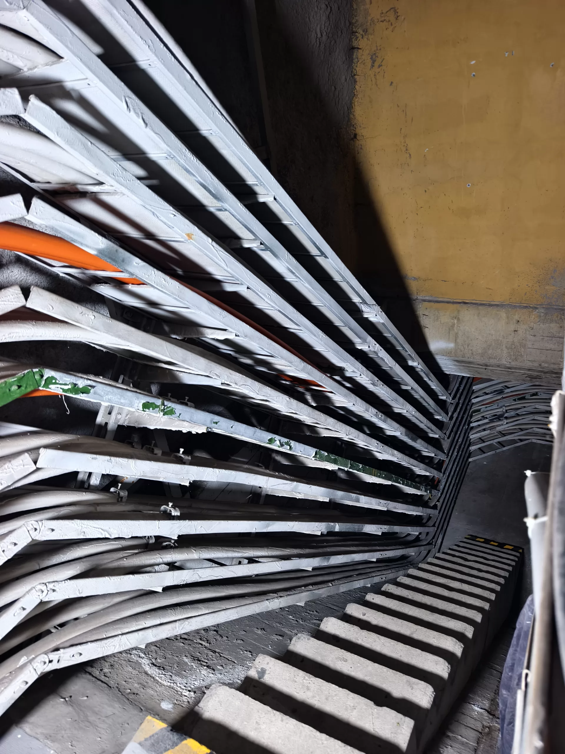 Ukázka vedení kabeláže v krytu u Strahovského krytu civilní ochrany z horní části u samotného velína směrem dolů k tunelu.