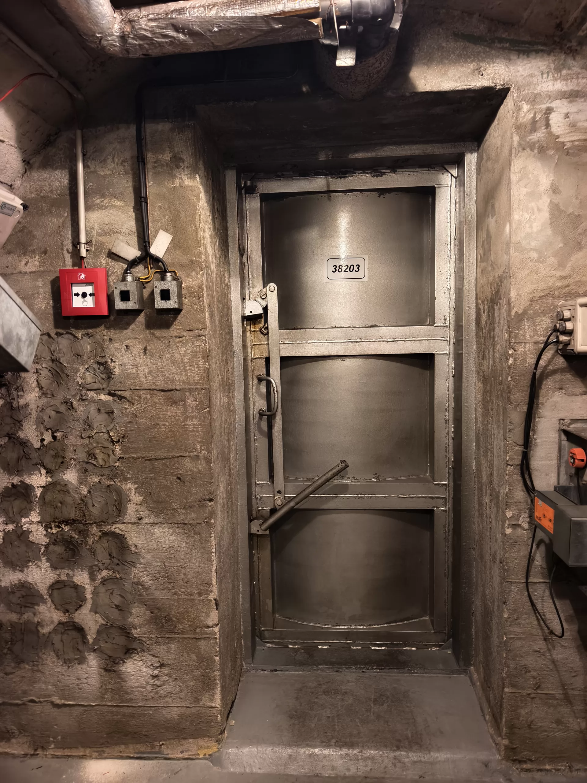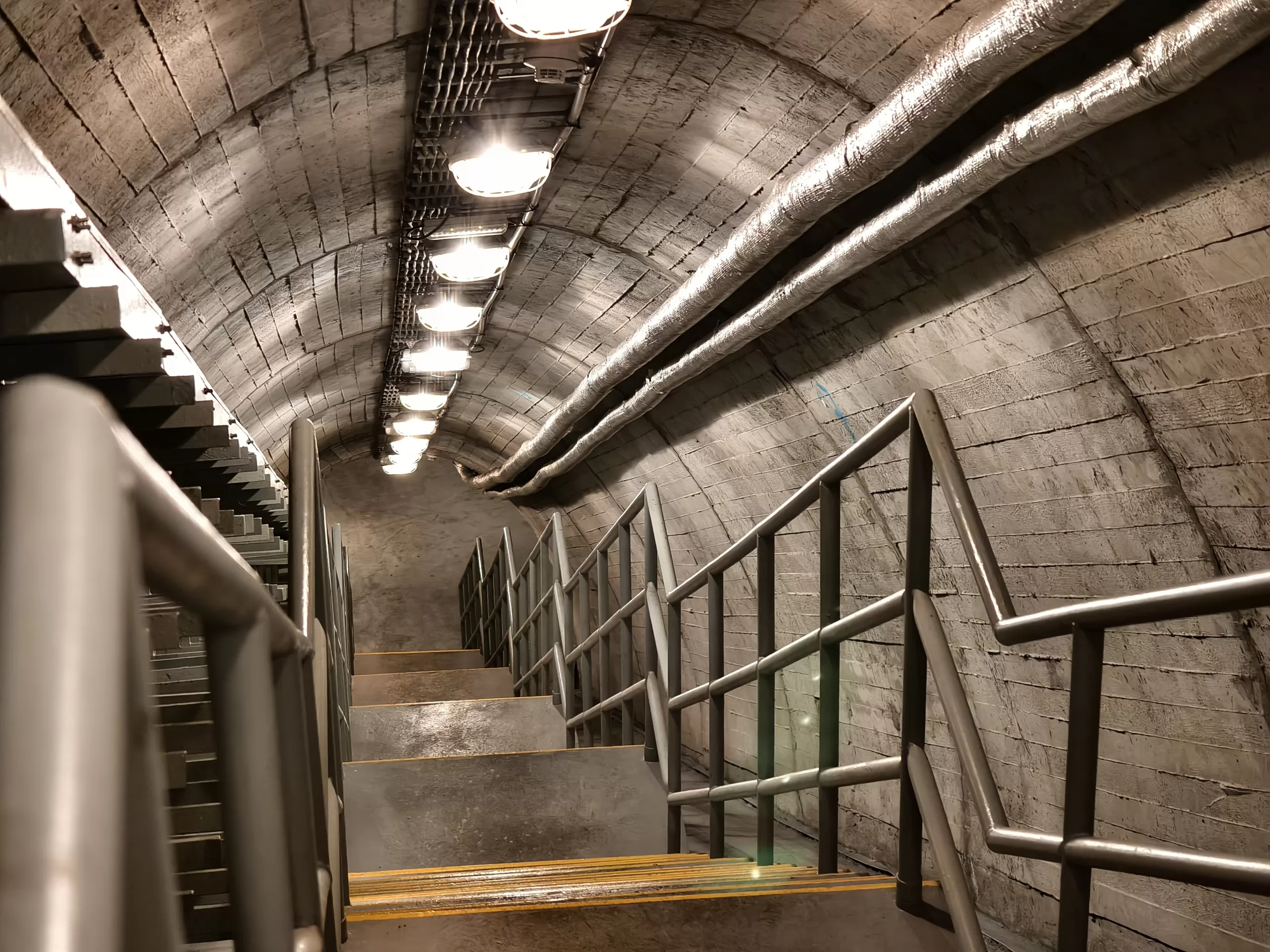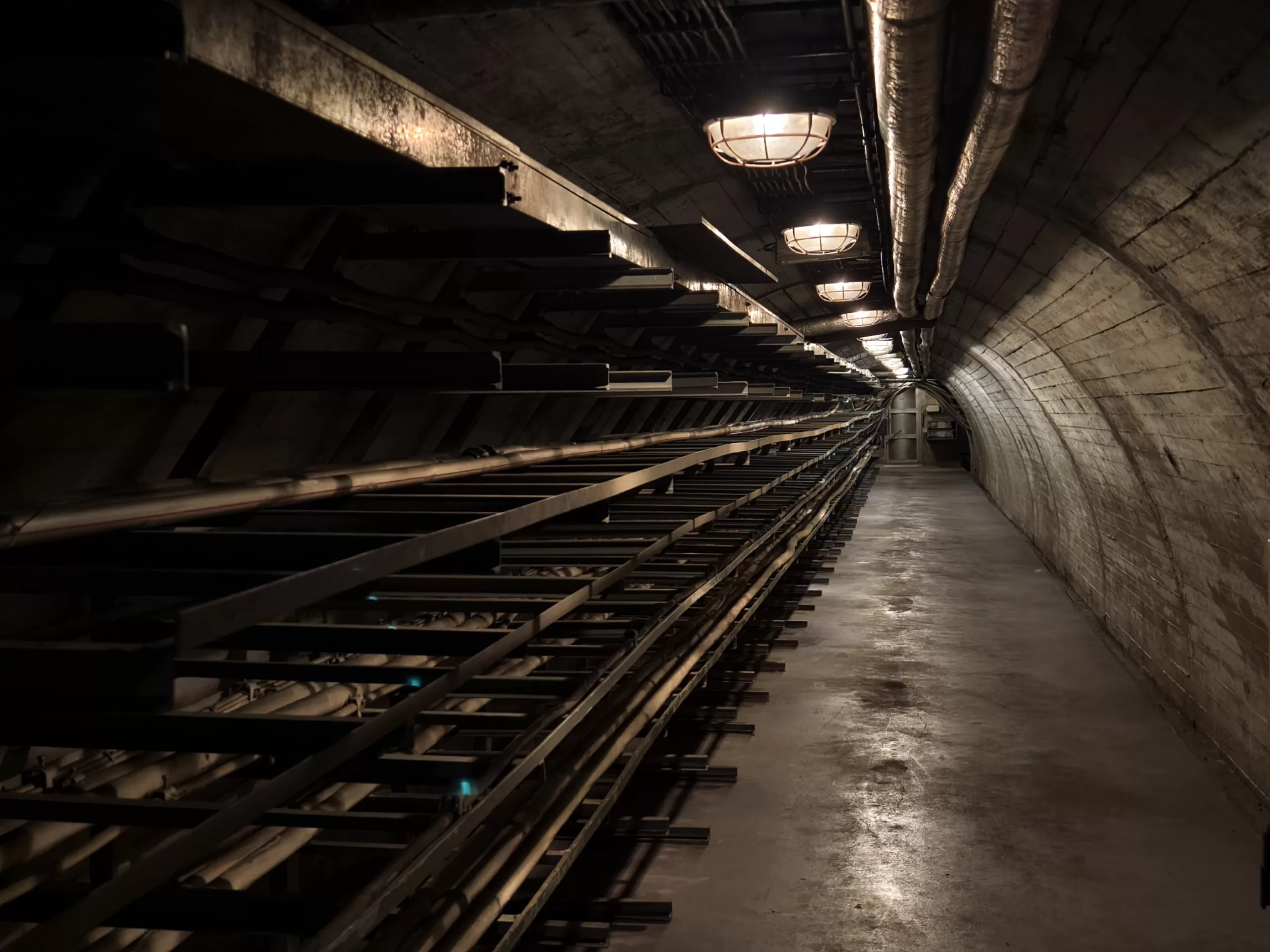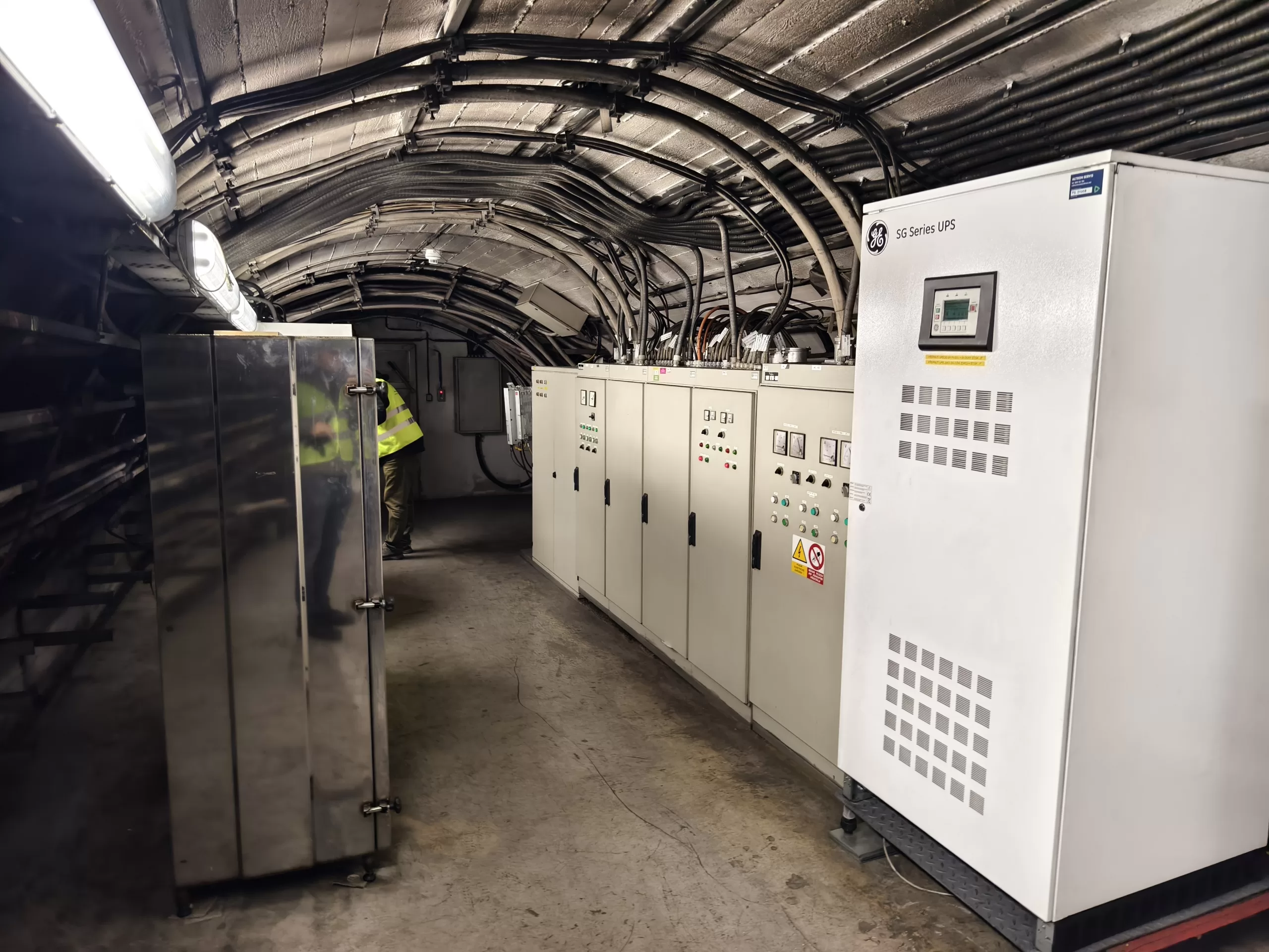 Ukázka vedení kabeláže v krytu u Strahovského krytu civilní ochrany z horní části u samotného velína směrem dolů k tunelu.