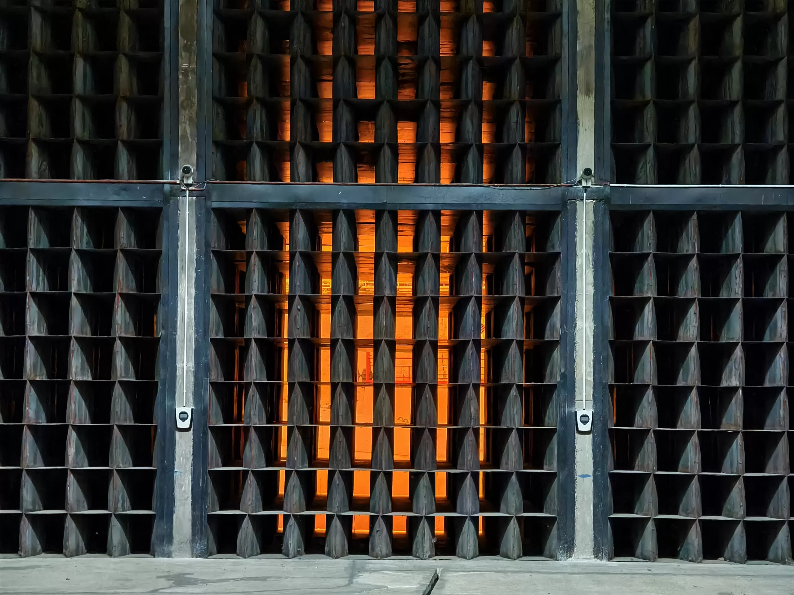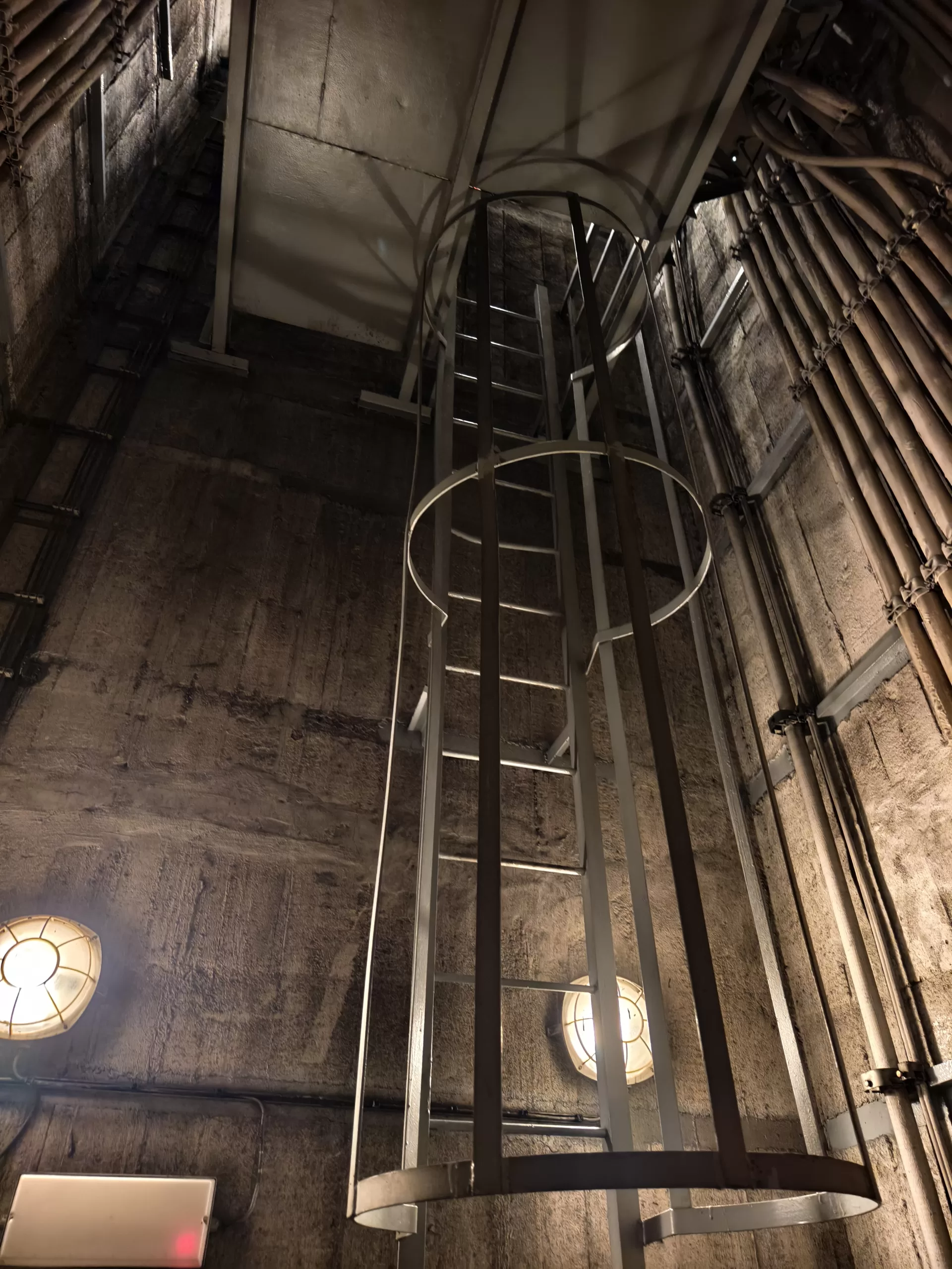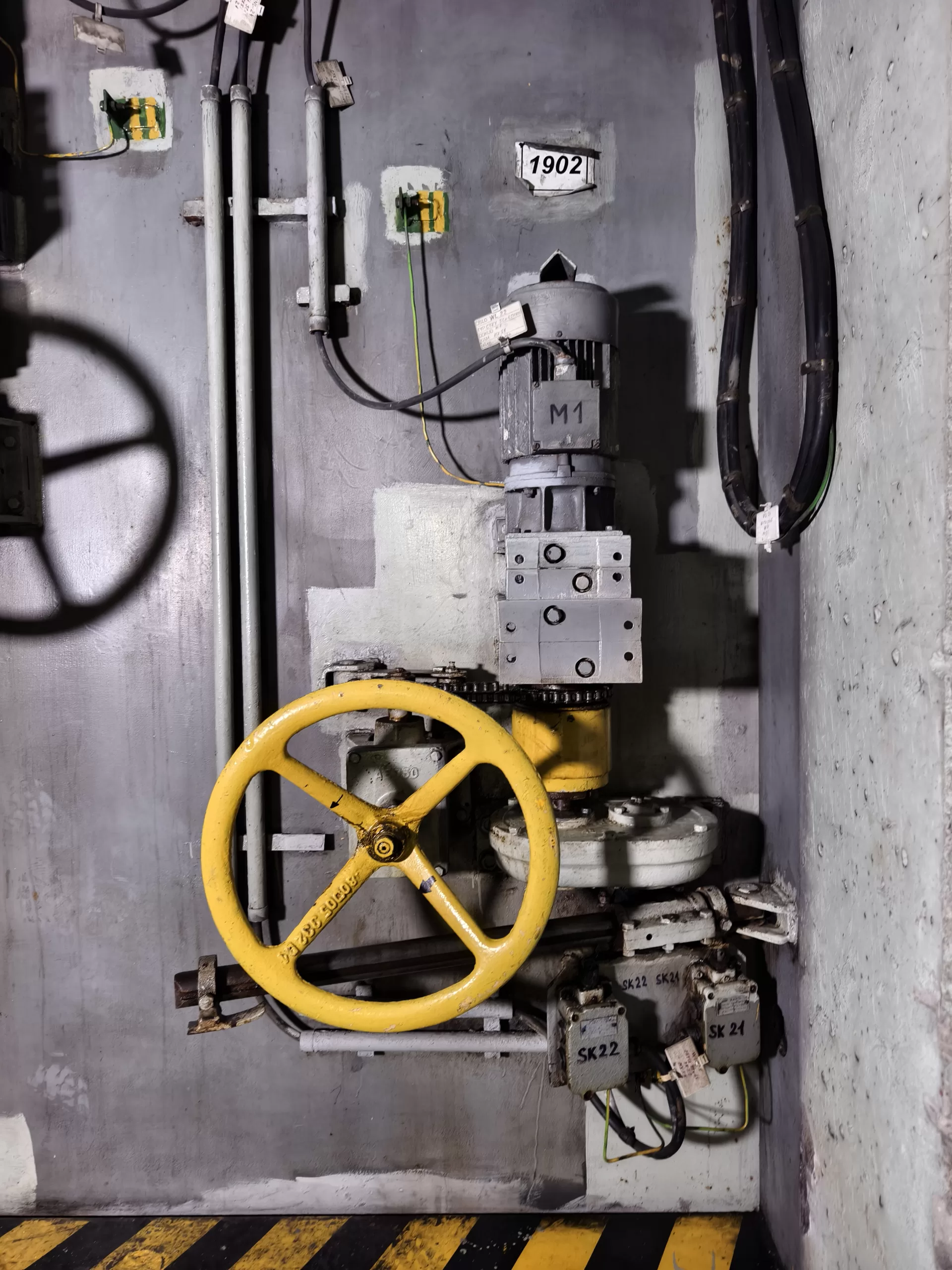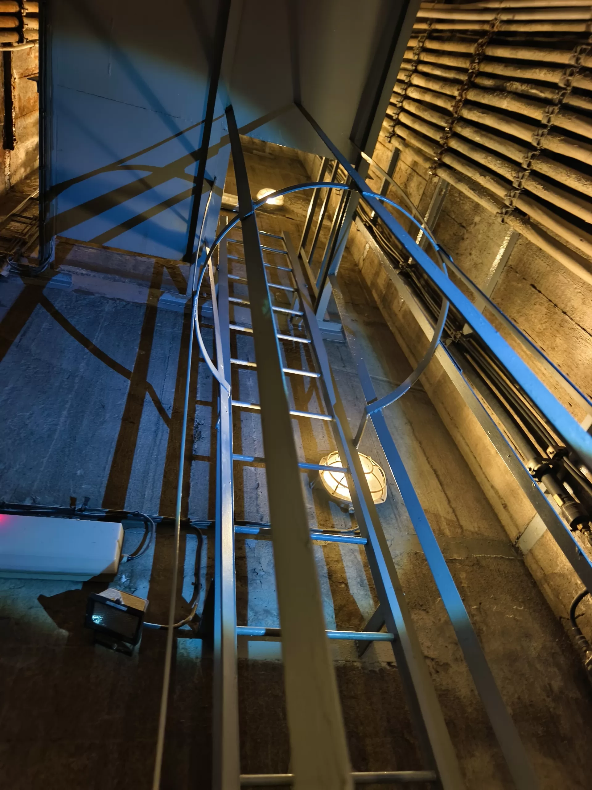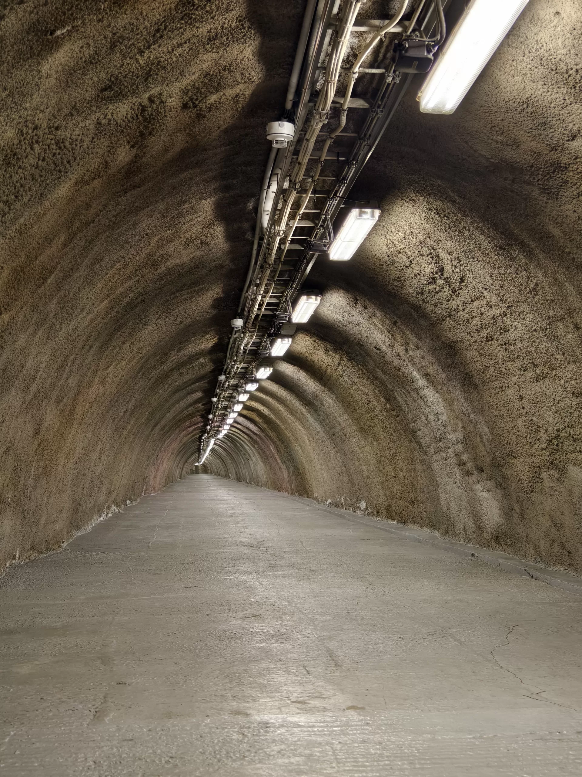 Ukázka vedení kabeláže v krytu u Strahovského krytu civilní ochrany z horní části u samotného velína směrem dolů k tunelu.