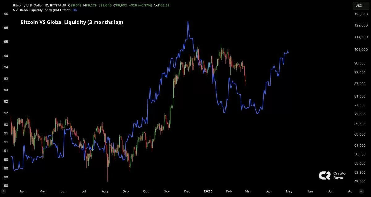 Crypto analytik Crypto Rover tento fakt zdůraznil ve svém příspěvku na X: „Globální likvidita výrazně posiluje. Bitcoin ji bude brzy následovat.”
