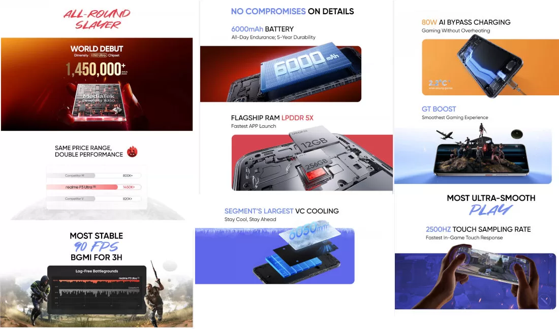 Daleko zajímavějším přírůstkem bude P3 Ultra, kde si odbyje premiéru výkonný procesor Dimensity 8350 Ultra od MediaTeku. Dále se ukáže RAM typu LPDDR5x a úložiště UFS 3.1. Mobilní hráče určitě osloví třeba výkonný systém chlazení s parní komorou (6 050 mm²). Nakonec ještě záda obsadí 6 000mAh bateriový článek s technologií rychlého 80W nabíjení.