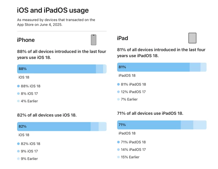 O takovém výsledku si může Google nechat jen zdát. Apple uvádí, že 82 % iPhonů má iOS 18, tedy nejnovější stabilní verzi. Již neuvádí ale, jak jsou na tom jednotlivé pod verze. Je celkem zajímavé, že nám poskytl v podstatě dvě statistiky, kde je uvedeno, že iOS 18 má 88 % zařízení, která byla uvedena v posledních čtyřech letech. Asi chtěl mít v této zprávě vyšší číslo.