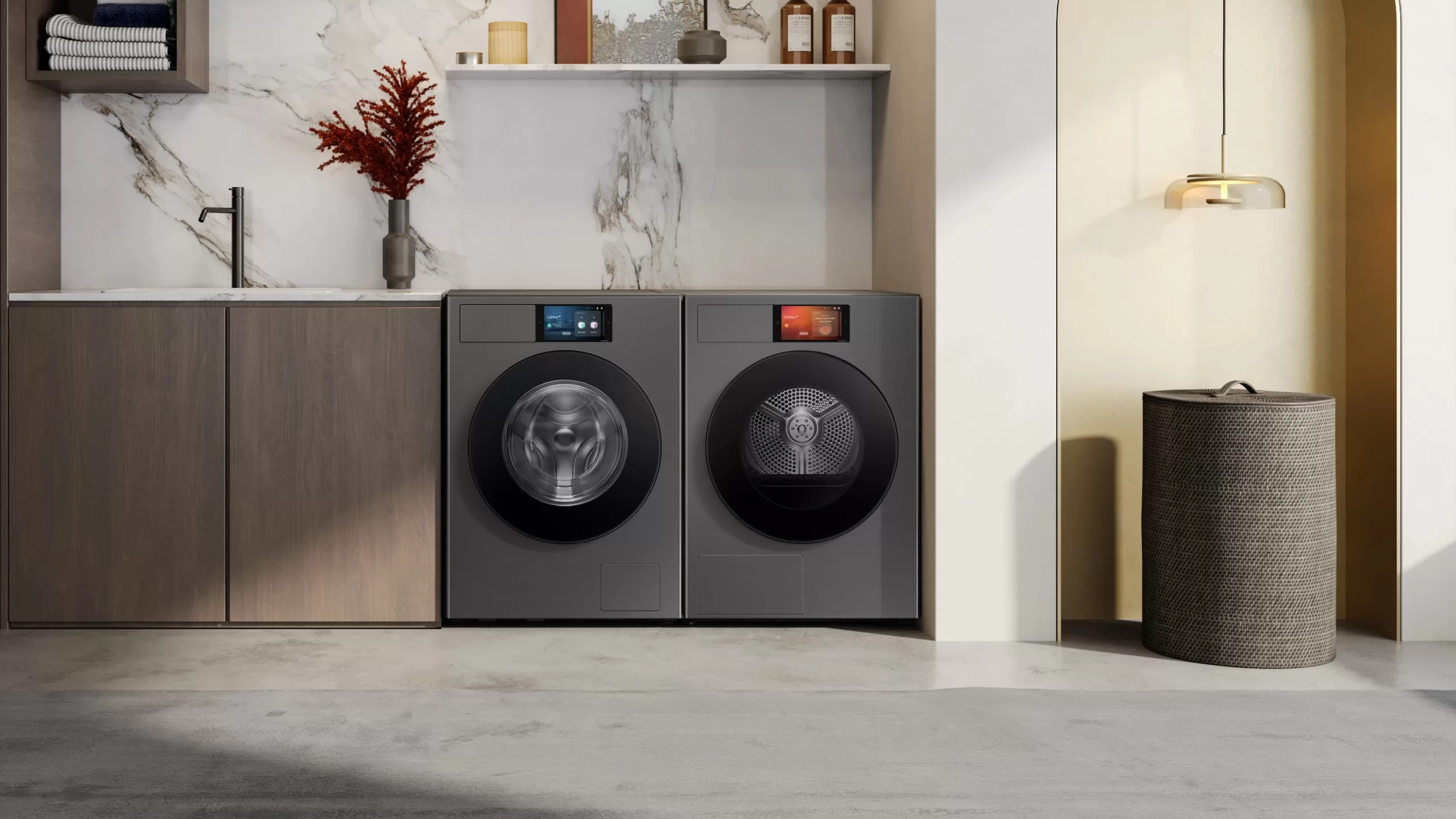Popis fotky: Set pračky a sušičky Samsung Bespoke AI s ovládáním AI Home a 7” displejem.
