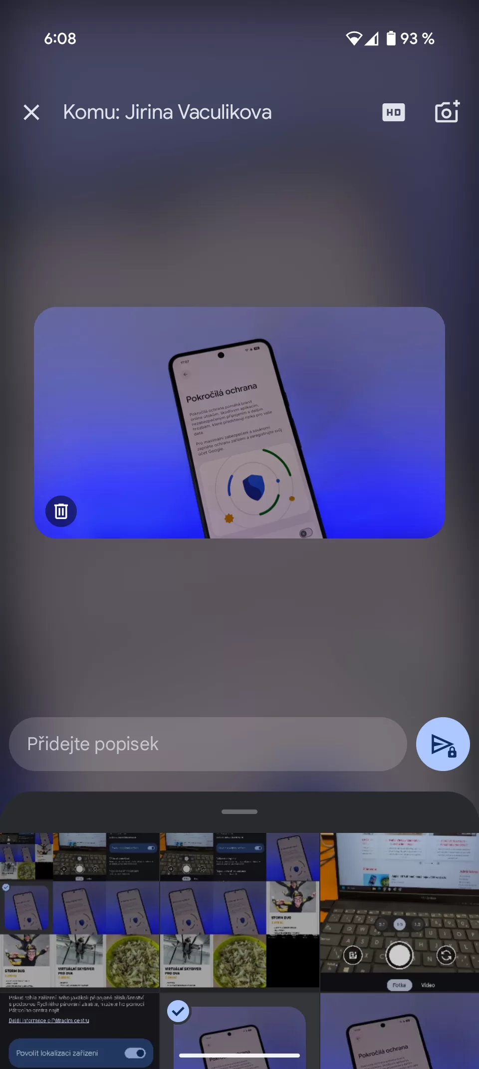 V dolní části se pak nabízí poslední fotky. Tuto část jde vysunout, čímž se dostane k delšímu seznamu, kde jde vybrat více fotek najednou. Následně při sdílení lze napsat popisek pro fotku a také lze nastavit kvalita. V základu je nastavena verze na HD, tedy optimalizace pro snímku s ohledem na úsporu dat a rychlejší poslání.