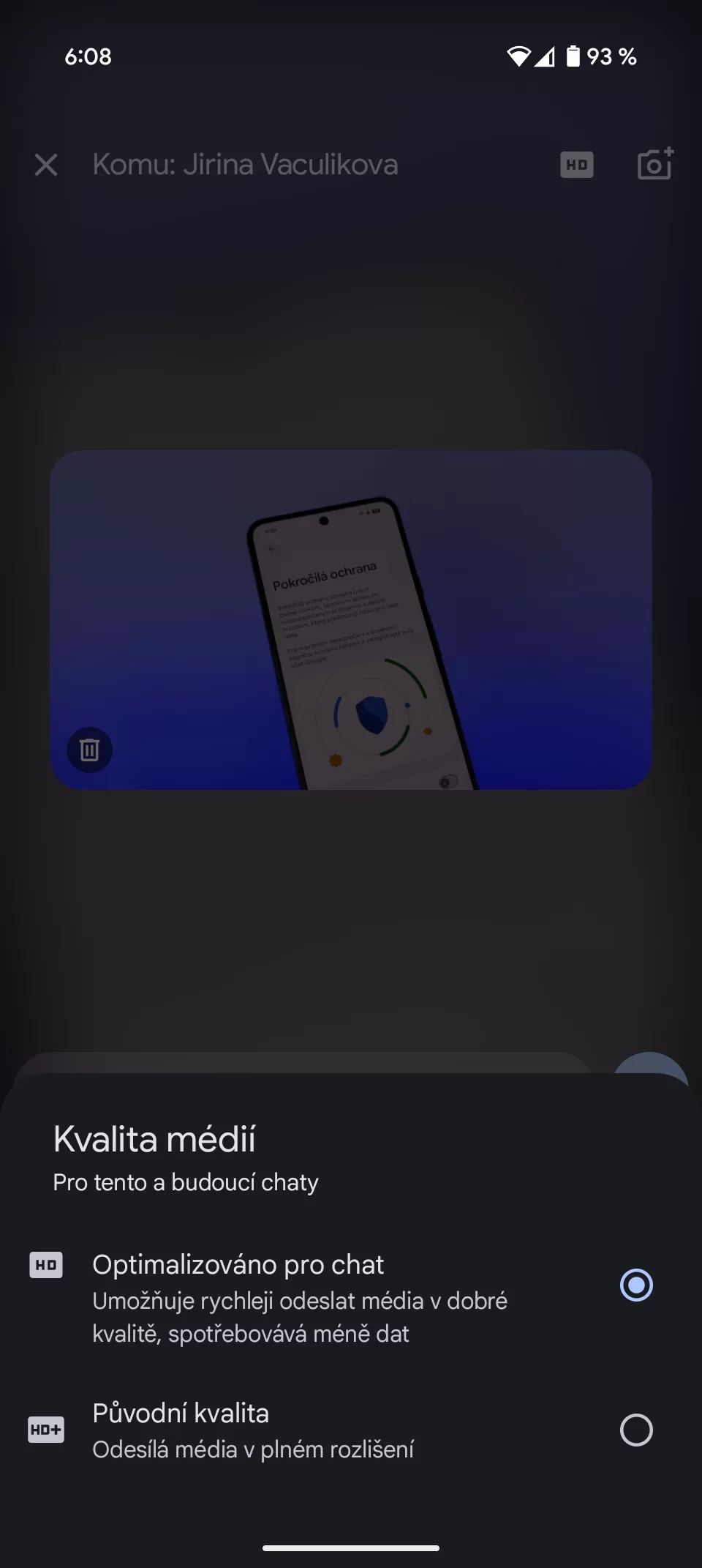 Verze HD+ v tomto případě znamená plná kvalita, tedy originální snímek. Tuto možnost najdete jen u RCS zpráv. Při standardním posílání skrze MMS se nenabízí, což je pochopitelné, jelikož MMS má svá omezení a běžnou velikost snímku by nešlo poslat. Nové rozhraní se začíná objevovat postupně. Nehledejte aktualizaci aplikace, jelikož Google aktivuje vylepšení vzdáleně skrze své servery.