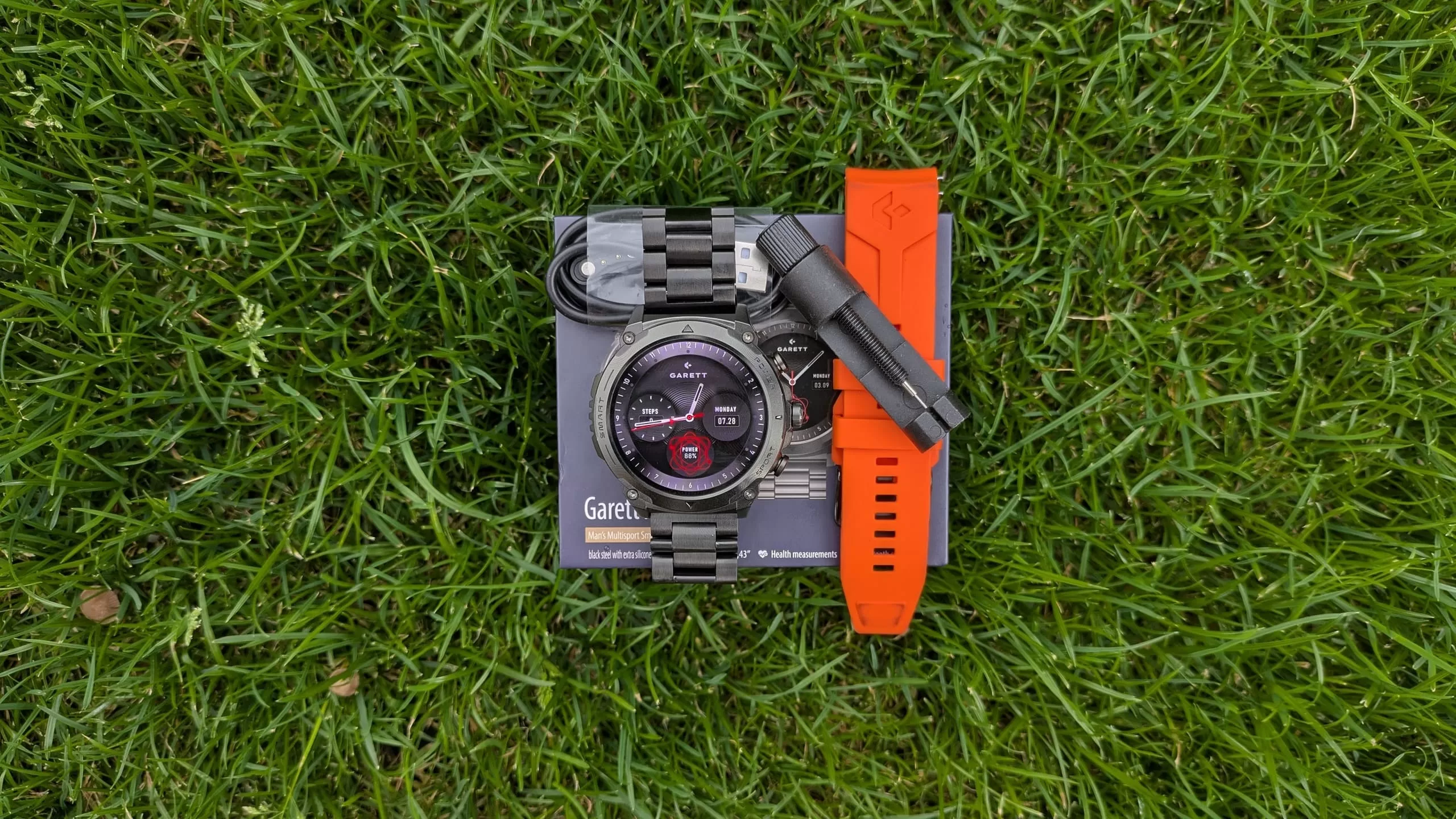 Tělo hodinek je vyrobeno z nerezové oceli a zachovává si lehkost – pouhých 65 gramů se silikonovým řemínkem a 115 gramů s ocelovým. V balení dostanete oba, na vás pak záleží, zda si zrovna jdete zaběhat či vyrážíte do divadla. Garett Atom jsou však jinak dostupné ve dvou barevných variantách: mnou testované černé nebo stříbrné.