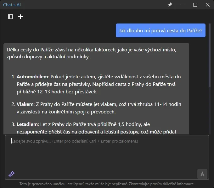 iTop Easy Desktop má integrovaný svůj vlastní vyhledávací engine, který se spustí stiskem kláves „Alt +S“, případně dvojím stisknutím klávesy „Ctrl“. Jeho součástí je i AI chat s vestavěnou umělou inteligencí. Ta sice nedokáže generovat obrázky, ale odpovědí a rad má obrovské množství, a její čeština je na úrovni.