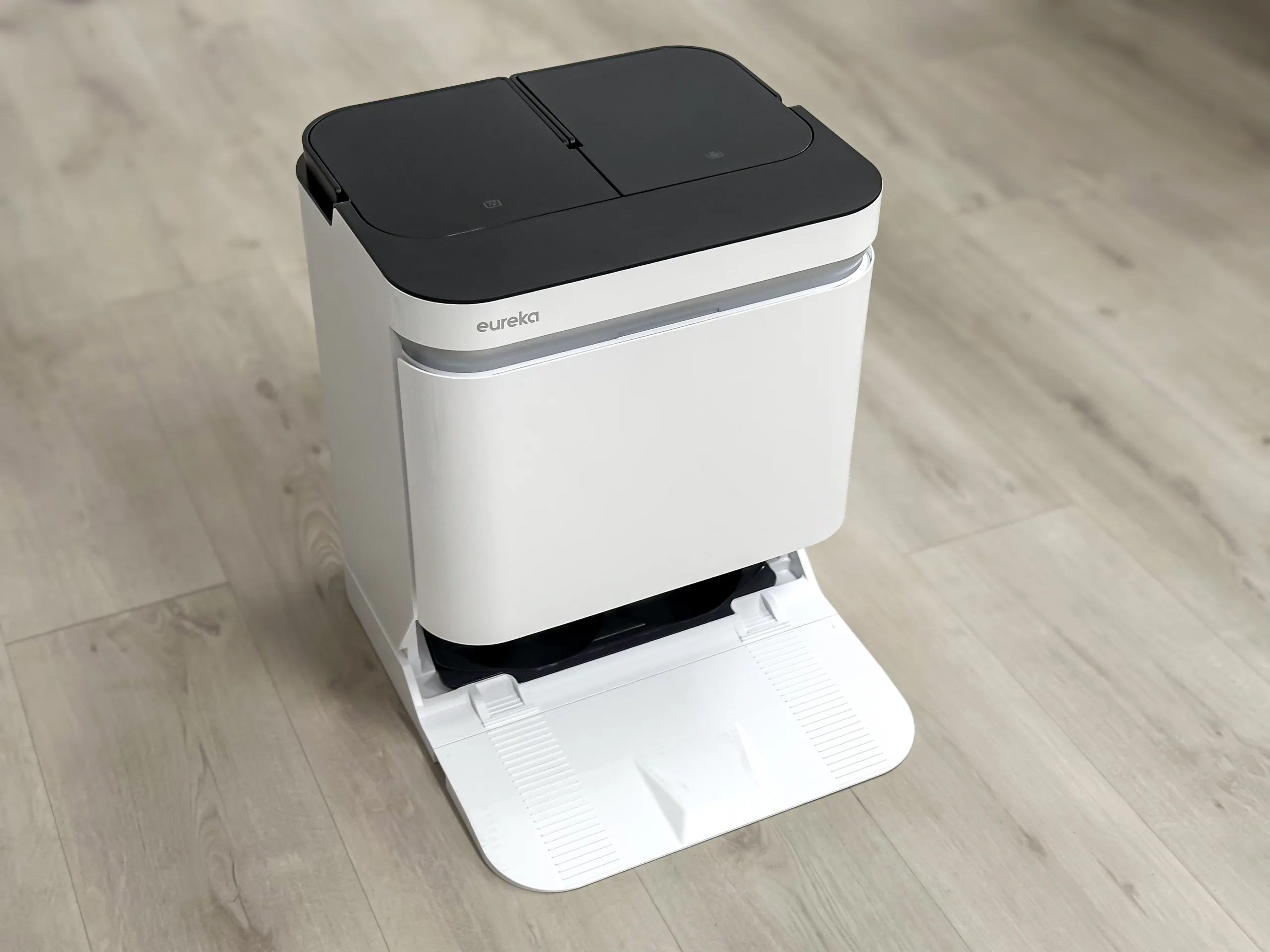 Ano – rohy, to je věčné téma u robotických vysavačů. Jak dostat kruh do rohu? Eureka u svého modelu J15 Pro Ultra na to jde svou cestou. Nebo spíše cestami. První z nich už jsem zmínil – speciální tvar těla vysavače. Druhým způsobem je pak speciální systém vysouvání ramen s mopy tak, aby efektivně dosáhly i tam, kam vysavač samotný zajet nemůže. Tento systém, známý i z vysavačů jiných značek, je u Eureky ještě doplněn konstantním tlakem ramene o síle 7 newtonů, který mop přitlačuje k zemi pro ještě vyšší účinnost.
