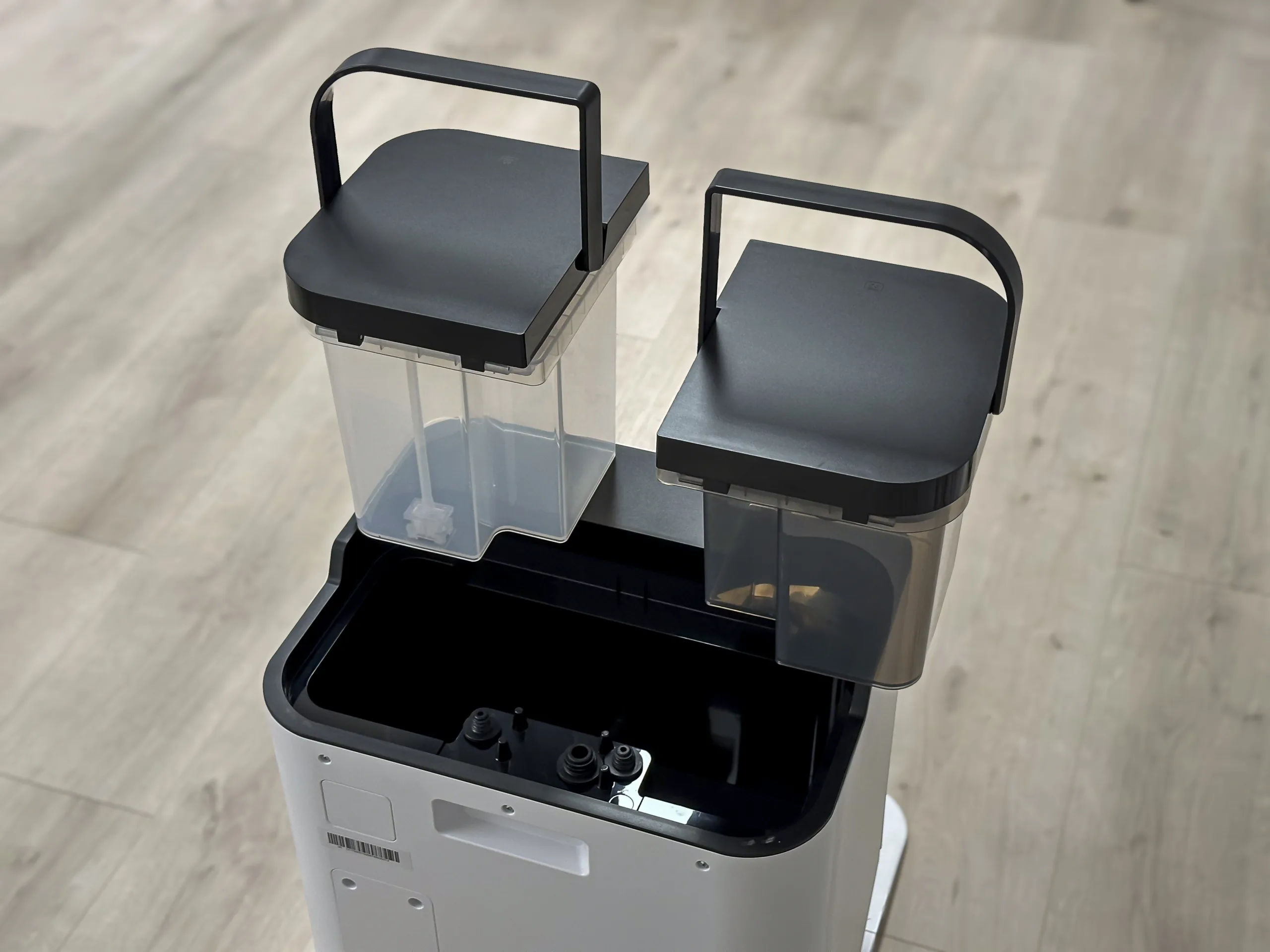 Další zajímavostí designu jsou menší rozměry základové stanice. Ačkoliv působí poměrně kompaktně, je v ní dostatek prostoru pro čtyřlitrovou nádrž na čistou vodu. Nádrž na vodu špinavou pak má objem 3,4 litrů, a sáček na prach pak pojme až 3 litry. U mne určitě plus za to, že se rozměry neplýtvá, a stanice nezabírá zbytečně moc místa na výšku.