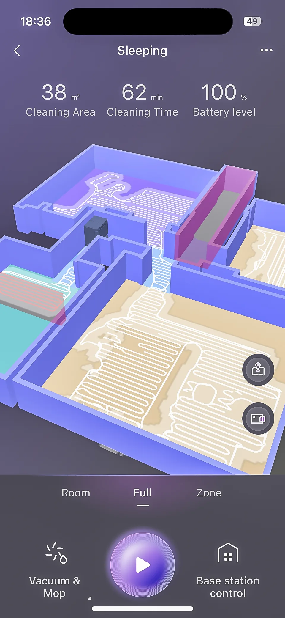 Vytvoření mapy úklidu probíhá prostřednictvím mobilní aplikace, a je to proces velmi jednoduchý. Co mě zaujalo: možnost vytvoření plnohodnotné 3D mapy, včetně toho, že můžete pomocí prstů mapou rotovat, přibližovat ji i oddalovat. Možnosti editace mapy jsou jednoduše skvělé, včetně například toho, že můžete do mapy vkládat 3D modely nábytku. Jde to sice jen ve dvourozměrné variantě, ale při přepnutí do 3D je tam vidíte ve všech třech dimenzích.