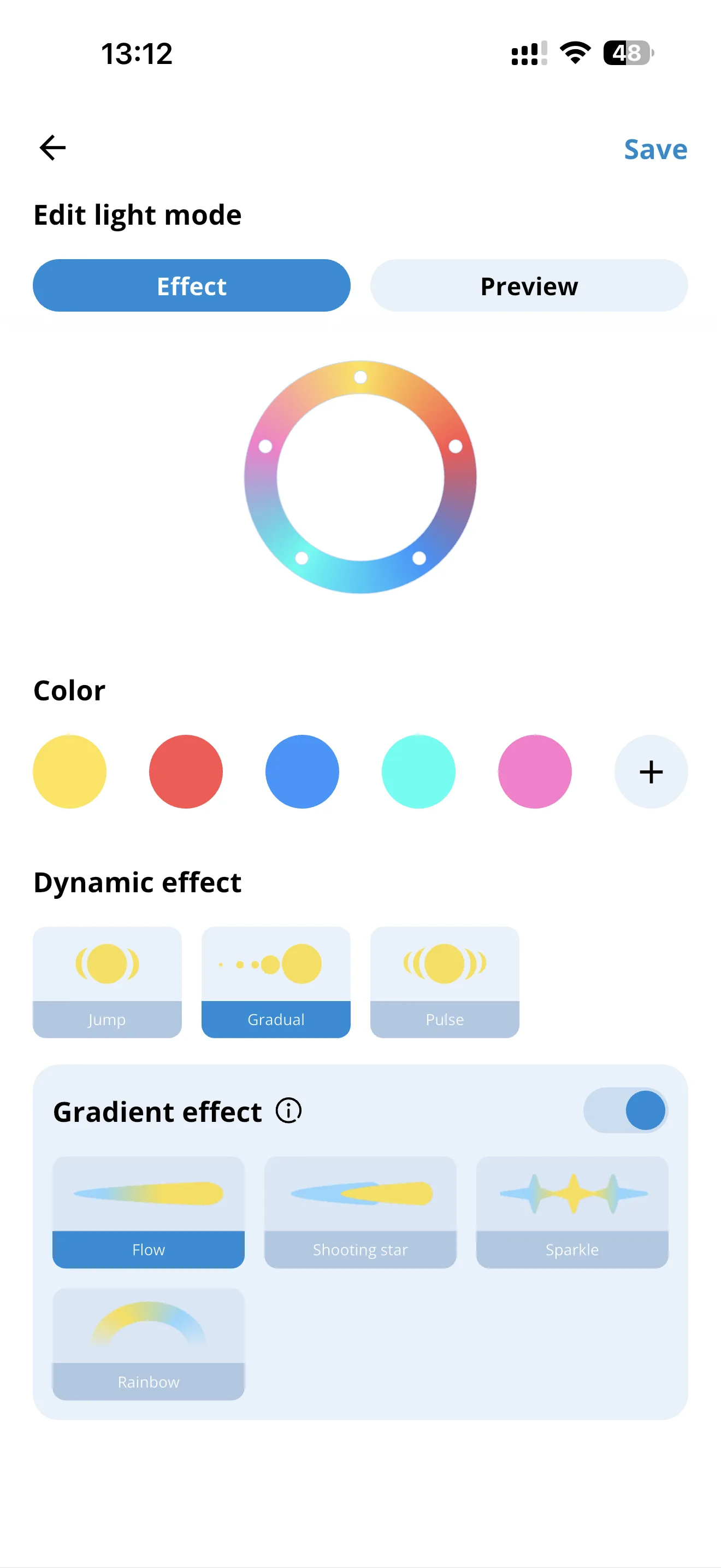 WiZ Gradient Floor Light může svítit buď jen celistvou jednou barvou a nebo můžete díky vlastní aplikaci využít mnoho předpřipravených efektů, kdy jsou barvy v různých částí tyče jiné. Potěšila mě možnost nastavit si, jak rychle se barvy proměňují. Pokud si pak nevyberete s předpřipravených efektů, lze si vytvořit vlastní, a to se mi moc líbí.