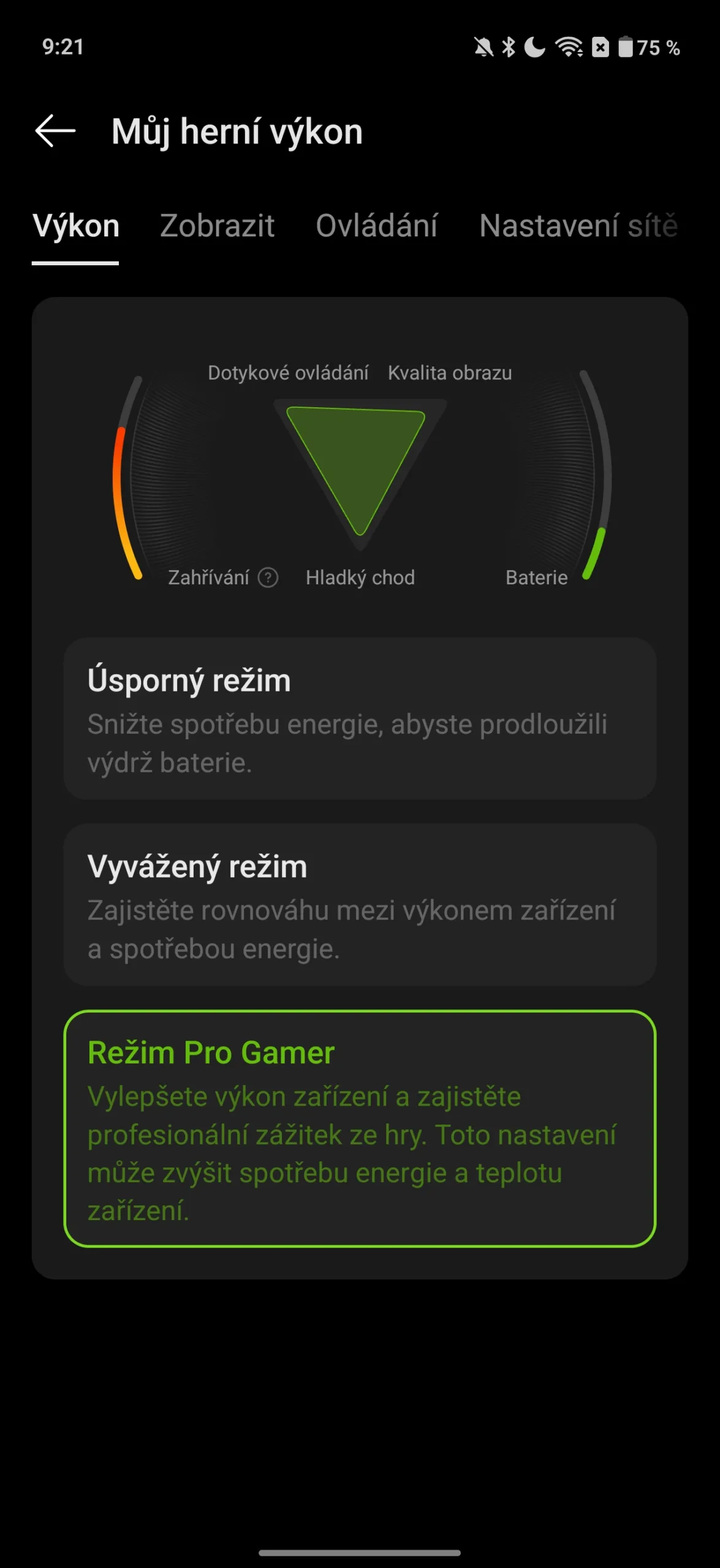 Režimy: úsporný, maximální výkon, normální; Zdroj: Dotekomanie.cz
