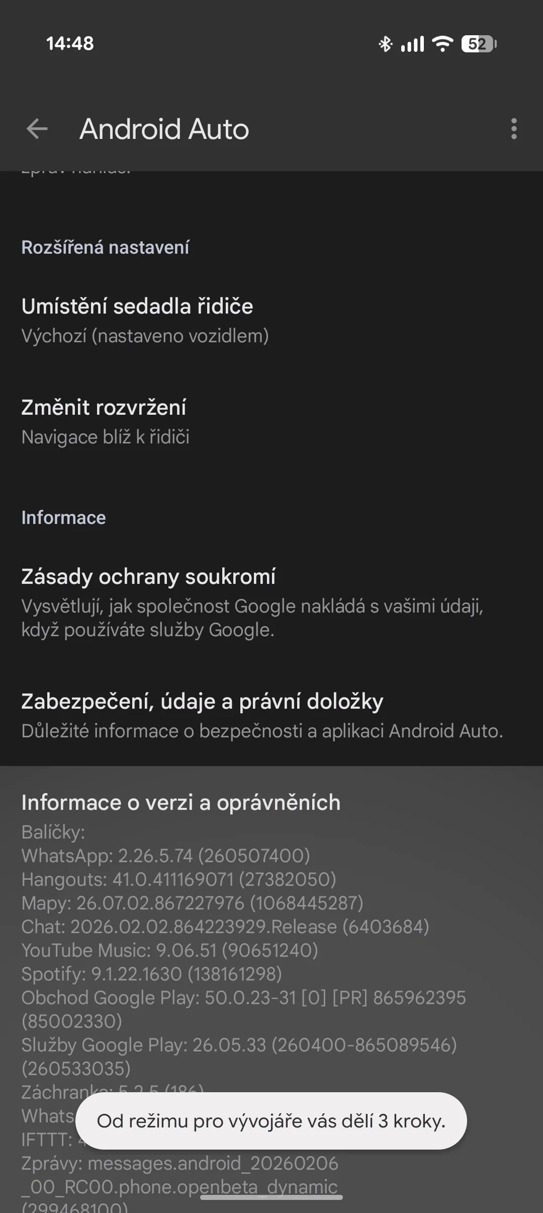 I v této části musíte jít úplně dolů, kde bude položka Verze. Na ni několikrát klikněte, dokud se vám nezobrazí varování, jako je tomu na druhém snímku dole. Po úspěšné aktivaci se v horním menu (tři tečky) následně zobrazí v nabídce Nastavení pro vývojáře.