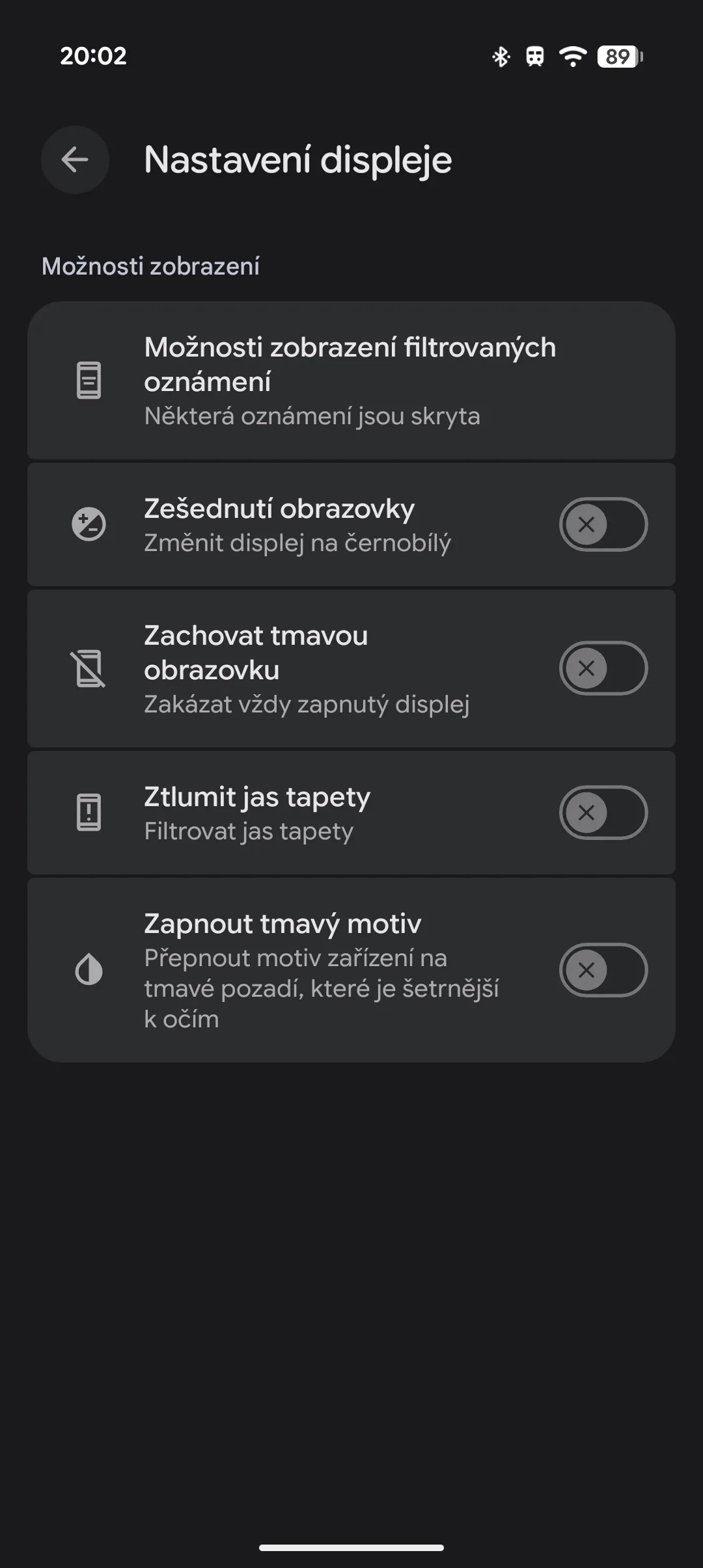 Jak je vidět na předposledním snímku, jde zvolit i speciální režimy nebo úpravy displeje. Poslední nastavení se týká celkového chováním, a to i v případě nastavení Bluetooth.