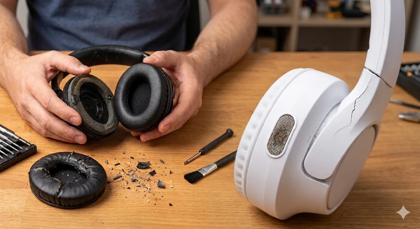Zrovna mi nyní v týdnu jeden náušník u tří let starých sluchátek upadl. A právě sluchátka pU větších sluchátek přes hlavu se nejčastěji opotřebovává materiál náušníků. Pěna nebo koženka časem zdegeneruje, zejména vlivem potu, a horší těsnění kolem uší pak ovlivní jak komfort, tak účinnost potlačení hluku. U levnějších modelů se k tomu přidává praskání plastového hlavového mostu, což bývá důsledek použití méně kvalitních materiálů. Náušníky jsou přitom u většiny značek vyměnitelné, ať již svépomocí, nebo přes servis.