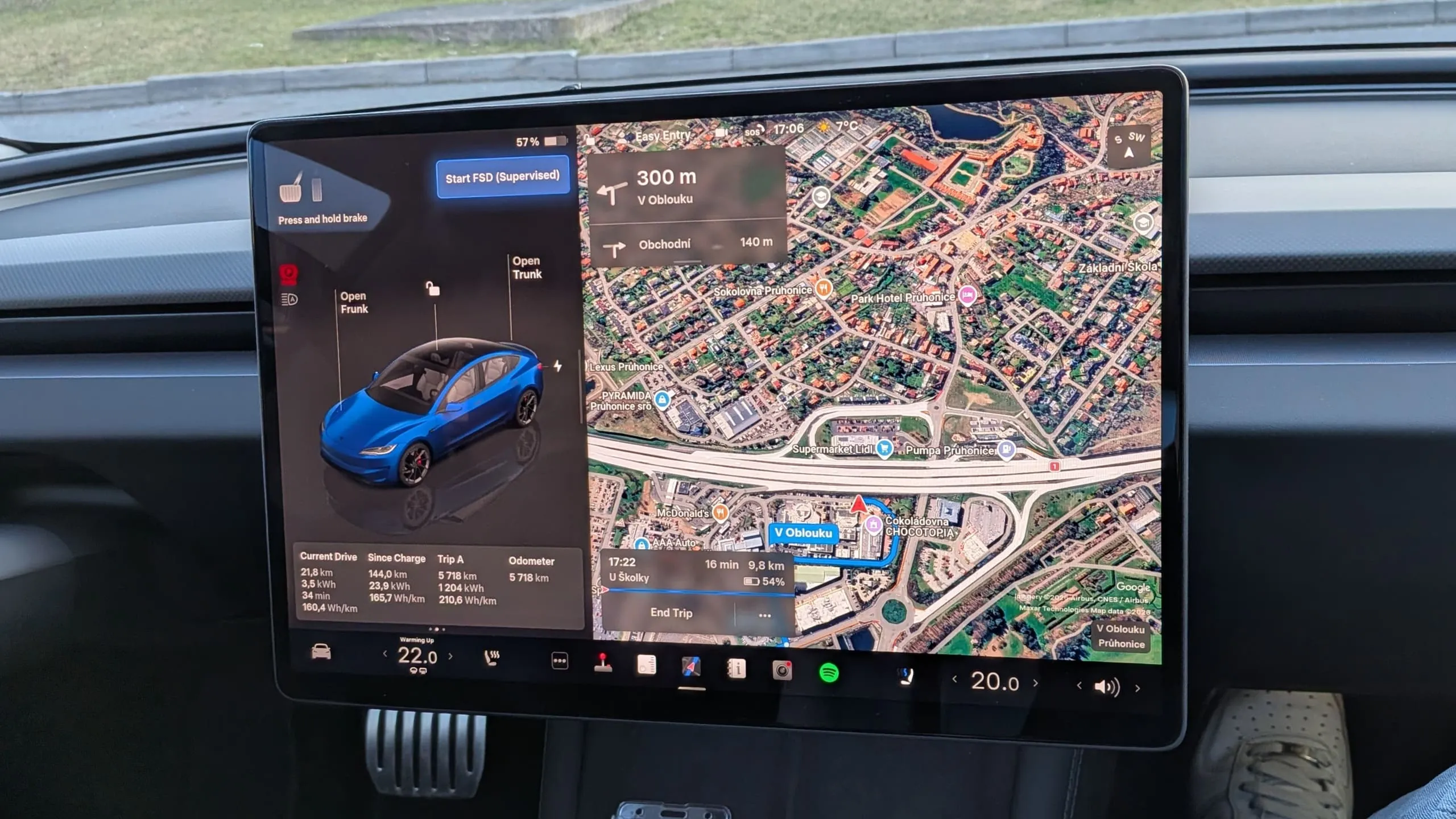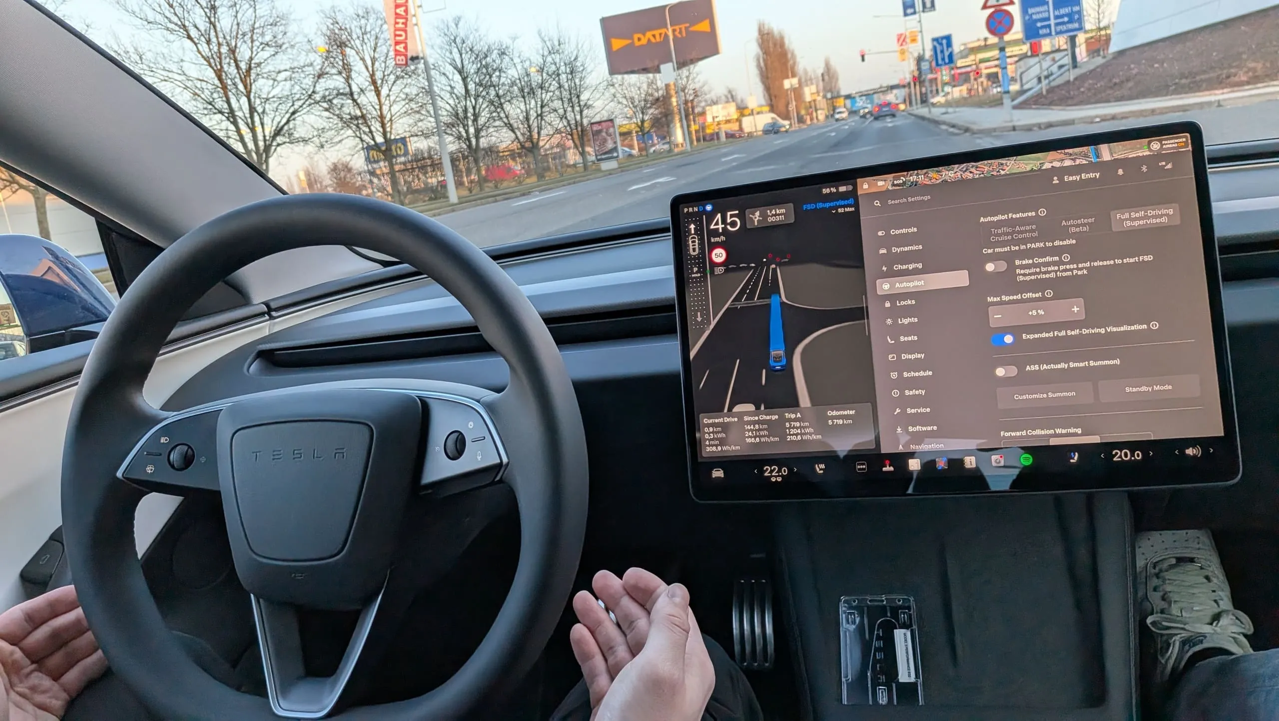 Z pobočky v Čestlicích jsme vyrazili do provozu a podrobili autonomní systém další zkoušce. Abych řekl pravdu, po prvních dvou minutách jízdy jsme byli na statistice dvou deaktivací FSD a nervozita i skepse byly cítit v kabině. Do konce třicetiminutové jízdy už ale auto zvládlo řídit úplně samo, a to se sebevědomím zkušeného řidiče.