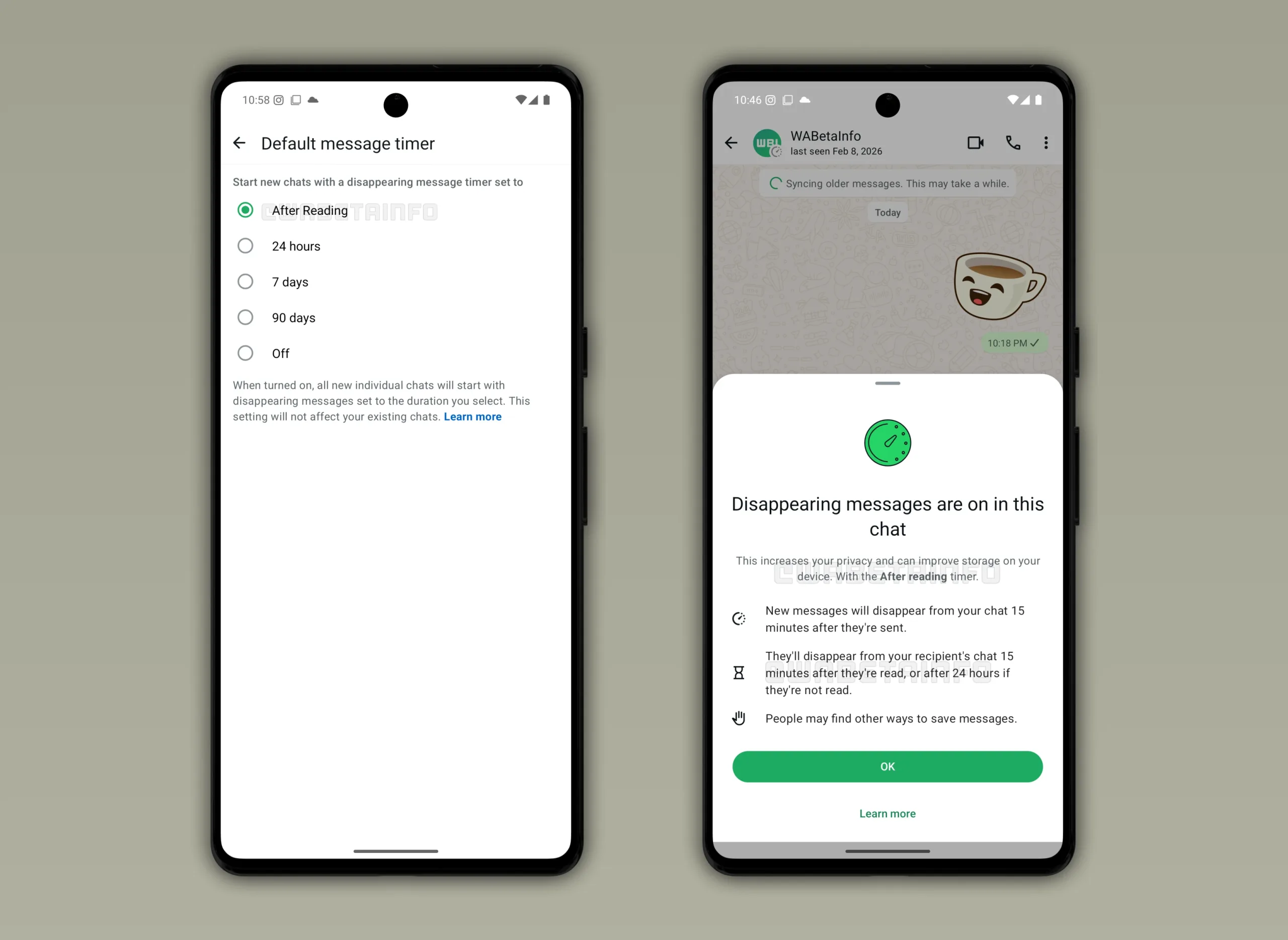 Aktuálně WhatsApp nabízí možnost nechat zprávy automaticky mizet po 24 hodinách, 7 dnech, nebo 90 dnech od přečtení. Jak informuje web WABetaInfo, v testovací verzi aplikace se objevila další varianta v časovače. Novinka nese pracovní název „After reading“. Jak název naznačuje, zprávy zmizí krátce poté, co si je protistrana přečte, konkrétně po 15 minutách.