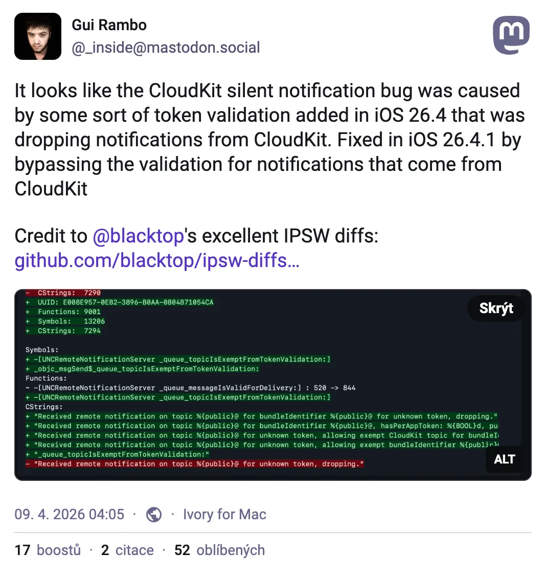 Zajímavým detailem je načasování nejnovější aktualizace systému. Apple v aktuální verzi iOS 26.4 změnil způsob, jakým systém ověřuje takzvané push tokeny – tedy klíče, které serverům říkají, kam mají oznámení posílat. Dosud totiž platilo, že server mohl posílat notifikace do telefonu i chvíli poté, co byla aplikace smazána, protože systém smazání neoznámil serveru okamžitě.